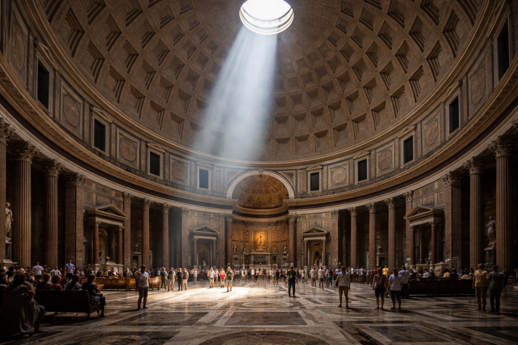Roma’da yapı ya da mekân yalnızca duvarlarla tanımlanmaz. Işık, gölge ve boşluk; tasarımın en az yapı elemanları kadar güçlü bileşenleridir. Özellikle kubbeli yapılarda ışığın mekân üzerindeki etkisi, tasarım kararlarında belirleyici bir rol oynar. Pantheon gibi yapılarda ışık yalnızca bir aydınlatma aracı değil, doğrudan tasarımın kendisidir. Tepedeki oculustan süzülen ışık, gün boyunca mekânı yeniden tanımlar ve kullanıcı deneyimini dinamik hâle getirir.